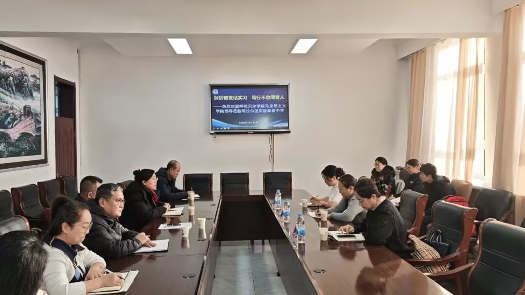 为强化实践教学基地共建,贯通大中小学思政教育协同育人链条,12月10日,马克思主义学院党委副书记刘琳、副院长明兰、学生教育实践指导教师刘鹤深入海拉尔区实验高级中学开展教育实习交流暨实践教学基地深化合作活动,海拉尔区实验高级中学党总支书记白海波、校长胡洪涛、副校长张然和政治学科教师共同参加了此次活动。